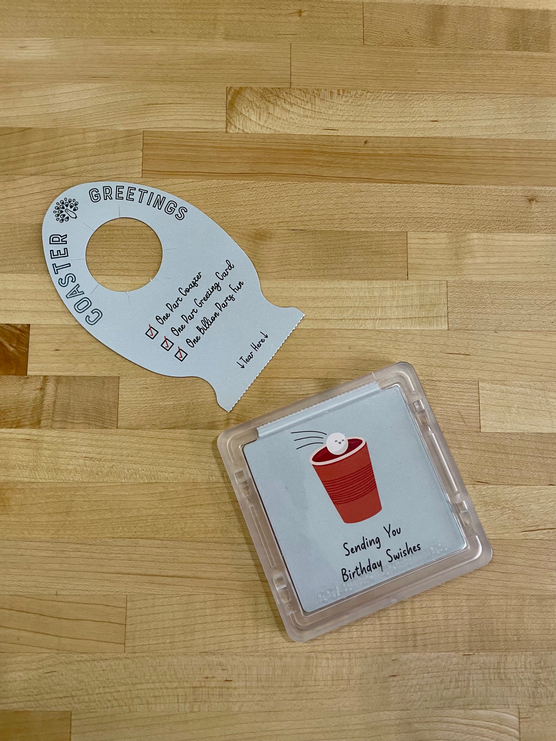 Gifting with Coaster Greetings is so much better than using those cheap, one-time-use wine bags that just get thrown away. It's been a few weeks since I gave this to my friend with a bottle of wine for his birthday, and I love seeing the coaster sit on his coffee table even after the wine is gone!